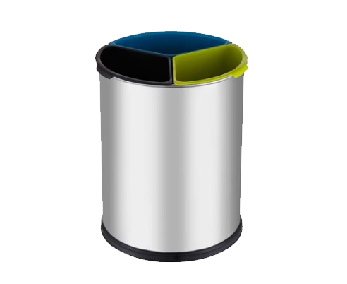 Papelera reciclaje 150L: Con cubetas separadoras de preselección. De acero inoxidable AISI 304, acabado del cuerpo satinado, y capacidad para 150 litros. Su estructura robusta es ideal para espacios que requieren una gran capacidad de almacenamiento y organización de residuos. Es ideal para centros de reciclaje, oficinas o instalaciones industriales. Su gran capacidad y diseño funcional la hacen perfecta para mantener la organización en áreas con alto volumen de deshechos. Además, es fácil de manejar y mantener.
